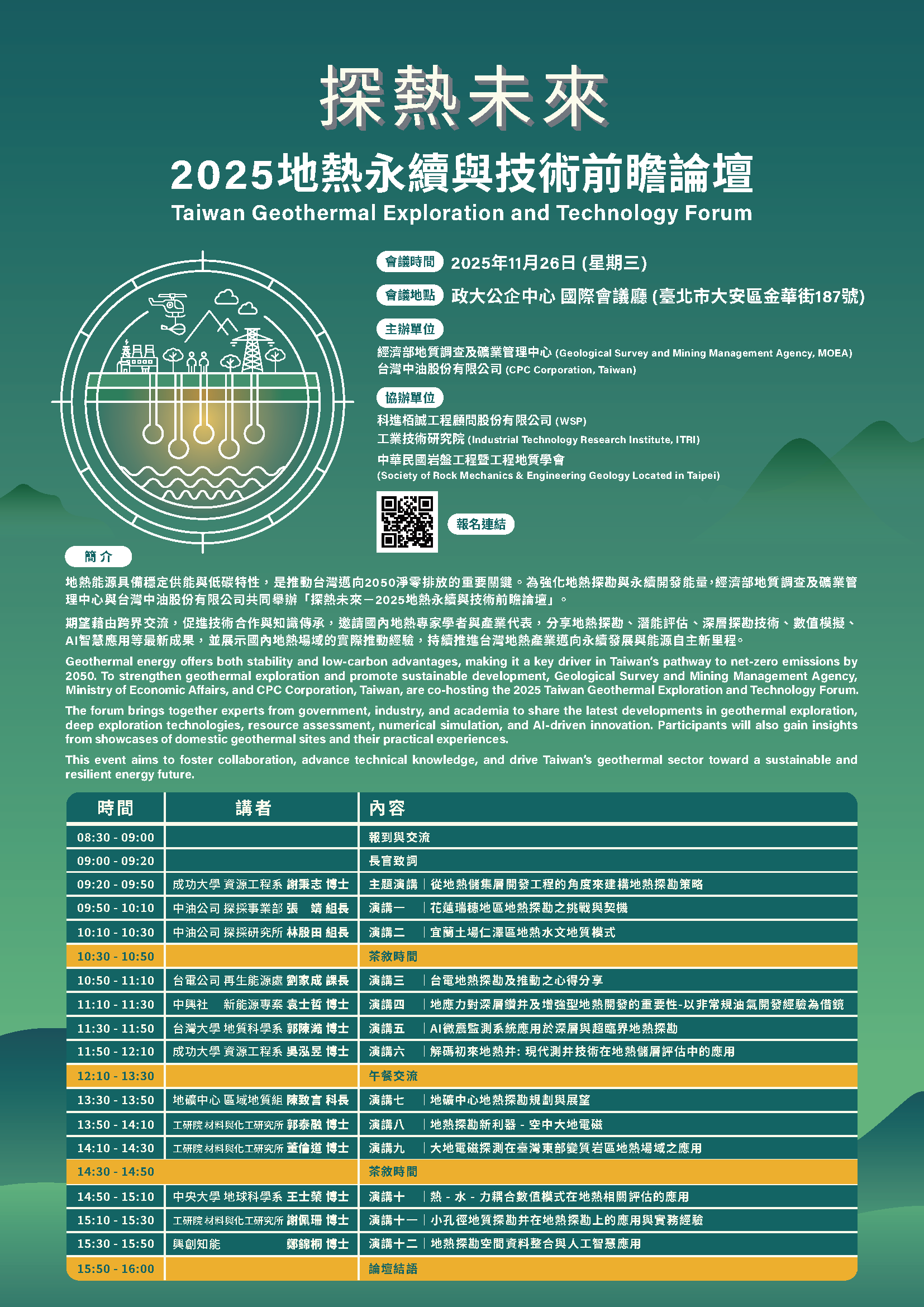 本次論壇邀請國內地熱專家學者與產業代表,包含地礦中心、中油、台電、工研院、中興社、台灣大學、成功大學、中央大學與興創公司等單位分享地熱探勘、潛能評估、深層探勘技術、數值模擬、AI智慧應用等最新成果,並展示國內地熱場域的實際推動經驗。