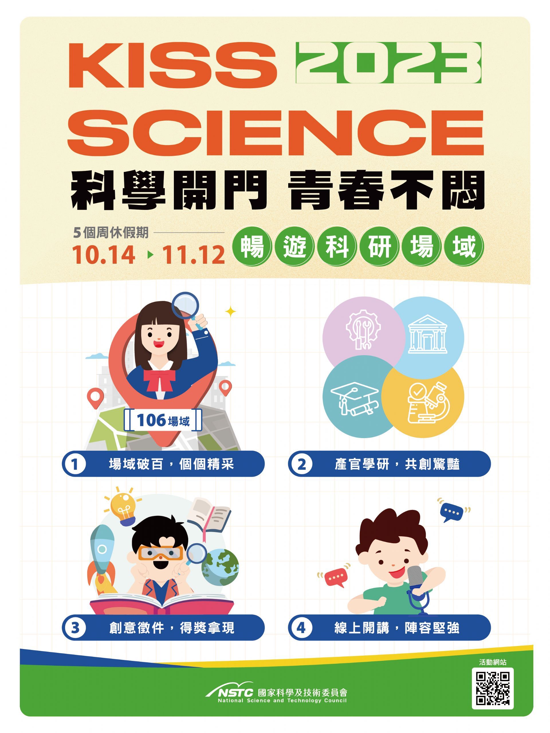 為鼓勵更多青年學子踏入平日不易觸及的科研場域,國科會連續5年舉辦「2023 Kiss Science—科學開門,青春不悶」活動,今年自10月14日起連續5個周休假期,集結產官學研各界能量,開放全臺106個場域,活動規模為歷年最大。國科會吳政忠主委鼓勵學生踴躍報名參加,透過生動有趣的方式或多元視角理解科學,關注臺灣科研成果及國際未來科技趨勢,以知識墊高視野及創造力,進而提高國家的全球競爭力。